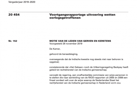 Dinsdag 11 februari 2020 is het D-Day voor de Indische Kwestie. De motie van de leden Van Gerven (SP) en Kerstens (PvdA), ‘verzoekt de regering om een onafhankelijke commissie van wijze personen in te stellen, die naar aanleiding van de NIOD rapporten uit 2005 en 2006 een finaal oordeel kan vellen over de wijze waarop de Nederlandse Staat het rechtsherstel van de Indische Gemeenschap in Nederland vorm zou moeten geven.’
