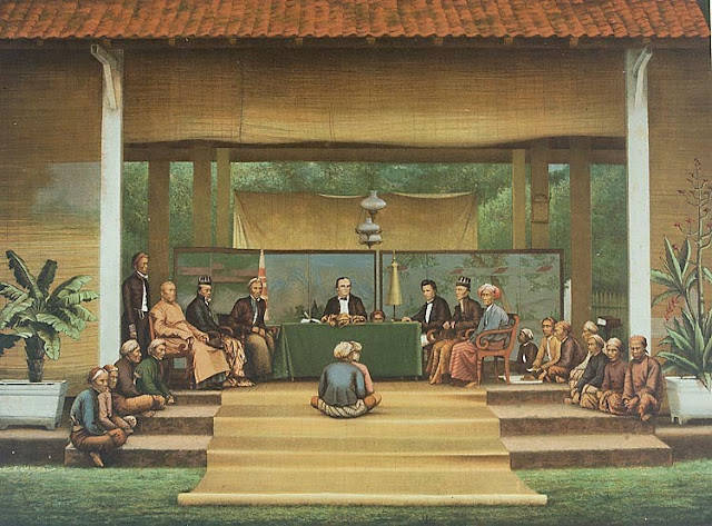 De vanuit Den Haag aangestuurde en strikte koloniale politiek was niet gebaseerd op rechtvaardigheid maar op winst en alhoewel het Indische gouvernement streefde naar eenheid met het Nederlandse recht ging het in de praktijk nadrukkelijk om het handhaven van rust en orde en veel minder om vrijheid, gelijkheid en broederschap. Op de litho een bijeenkomst van de ‘Landraad’ in Jepara.