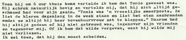 Anton was dus geen vrijgezel maar eigenlijk nog getrouwd en was door de rechtbank gedwongen om maandelijks alimentatie te betalen aan zijn aanstaande ex-vrouw die niet veel verder in een straatje bij de Keizersgracht woonde. Met vier kinderen waar zijn a.s. ex Tonia onder moeilijke omstandigheden hun kinderen alleen moest opvoeden. Eigenlijk wist Julie pas vanaf najaar 1948 dat Anton (nog) getrouwd was. In 1998 schrijft Julie voor het eerst wat er indertijd gebeurde.